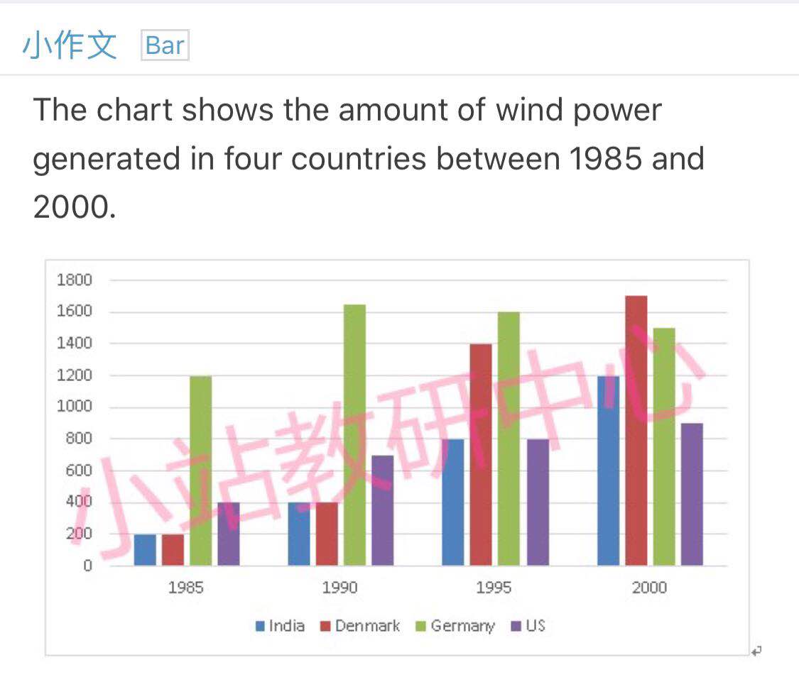 IELTS Writing P1 Bar---The amount of wind power generated in four countries between 1985 and 2000